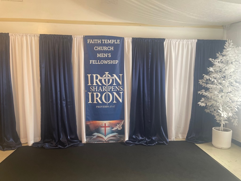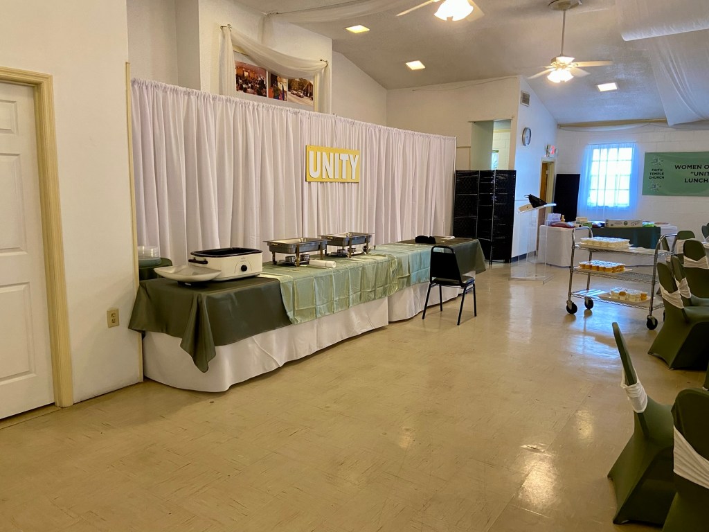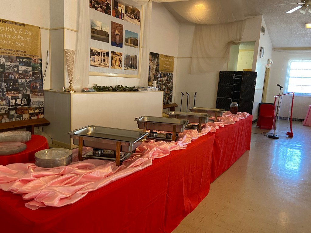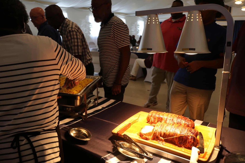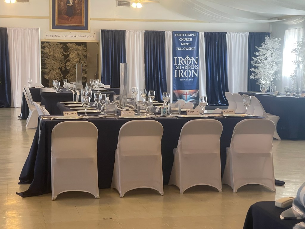 Faith Temple Church’s men’s fellowship, organized and awesome luncheon for the men young and old. K and D by Joyce decorated and catered the event with elegance and comfort, including a delicious pork loin wrapped in bacon and airplane chicken and side dishes of saffron rice, cabbage, and smoked sausage and more!